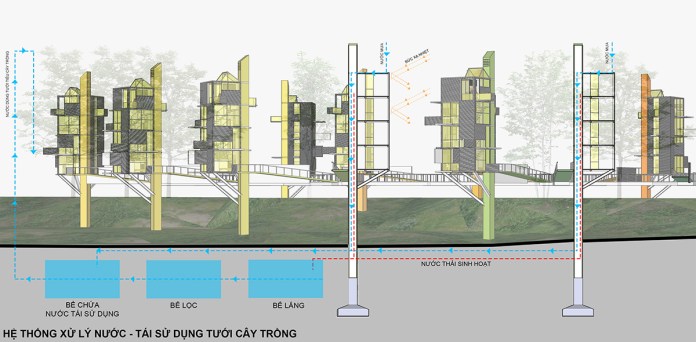 Các khối nhà ở được nâng lên cao khỏi mặt đất bằng một cột bê tông chịu lực chính, dành lại phần đất phía dưới công trình để phục vụ cho việc trồng cây nông nghiệp.
