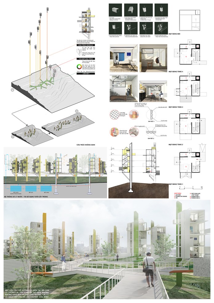 Nhóm thiết kế mong muốn những ngôi nhà thép lắp ghép được xây dựng trên chính những thửa ruộng nhưng không lấn chiếm diện tích đất nông nghiệp. Giải pháp chính là đưa các không gian ở lên cao. Các khối nhà được liên kết với nhau tạo thành tổ hợp bởi các không gian công cộng, không gian xanh gần gũi thiên nhiên.